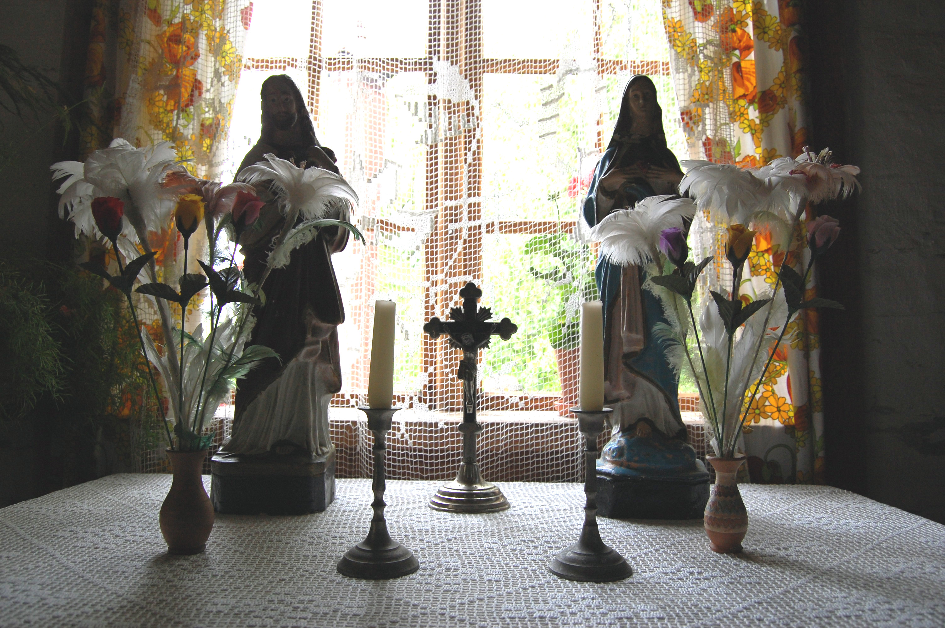 Stolik ze świętymi figurkami wystylizowany na „święty kat” z lat 60-tych XX w w chałupie ze wsi Baranowo.