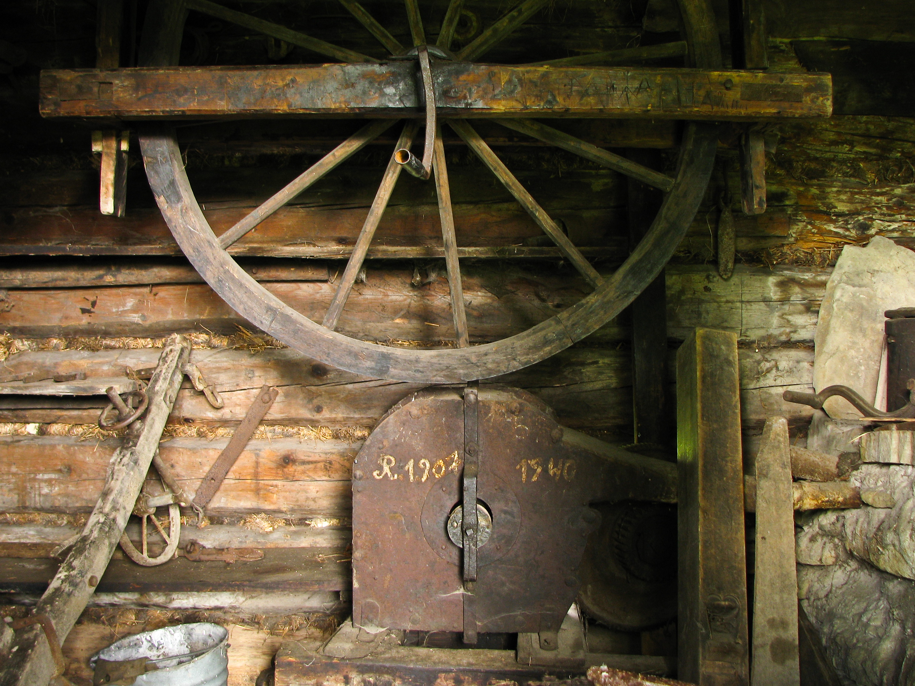 Wnętrze kuźni. Na ścianie wisi drewniane koło od wozu.
