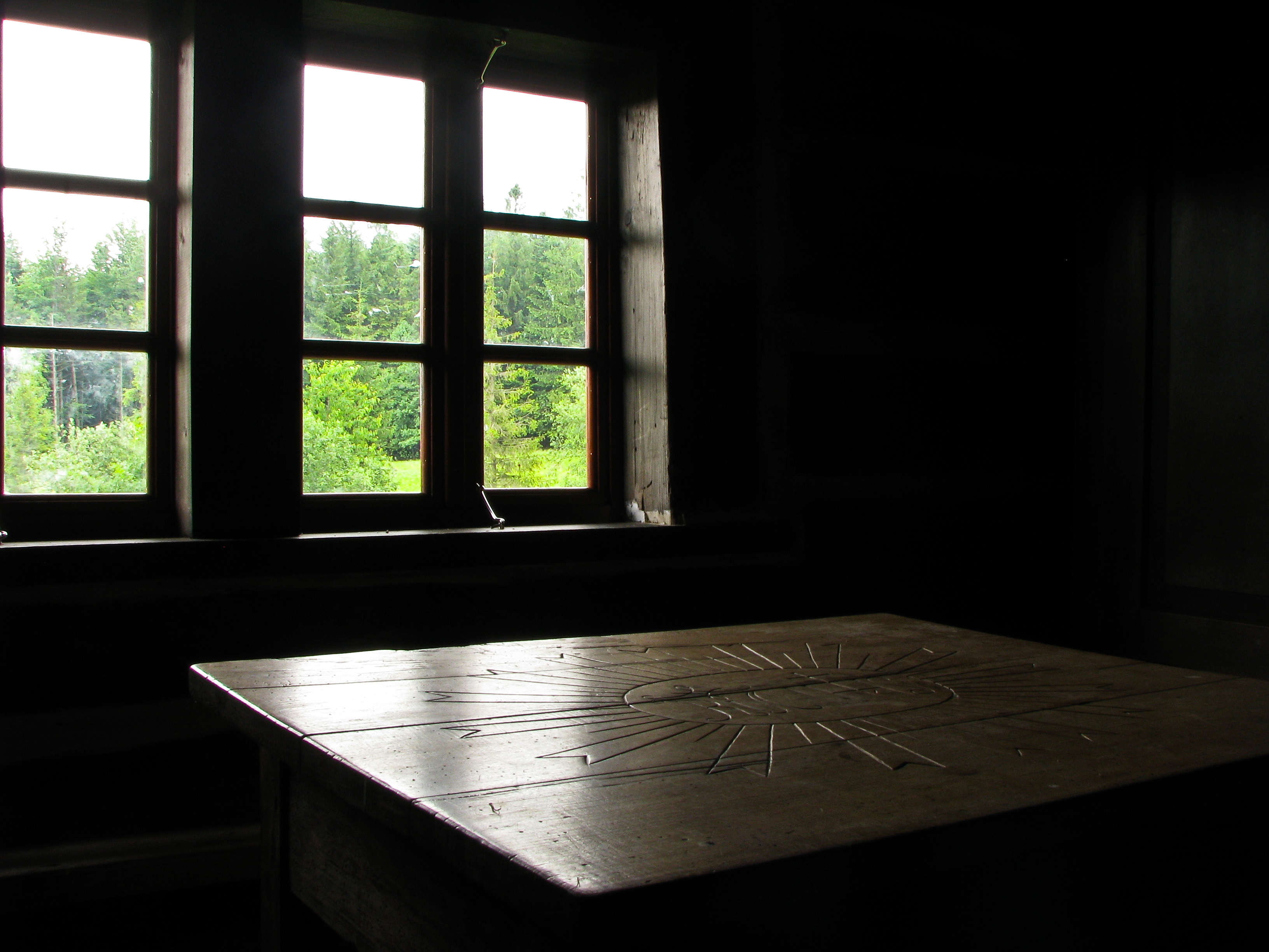 Wnętrze chałupy Słopiakowej. Na zdjęciu widoczny stół z ornamentem religijnym i okna.
