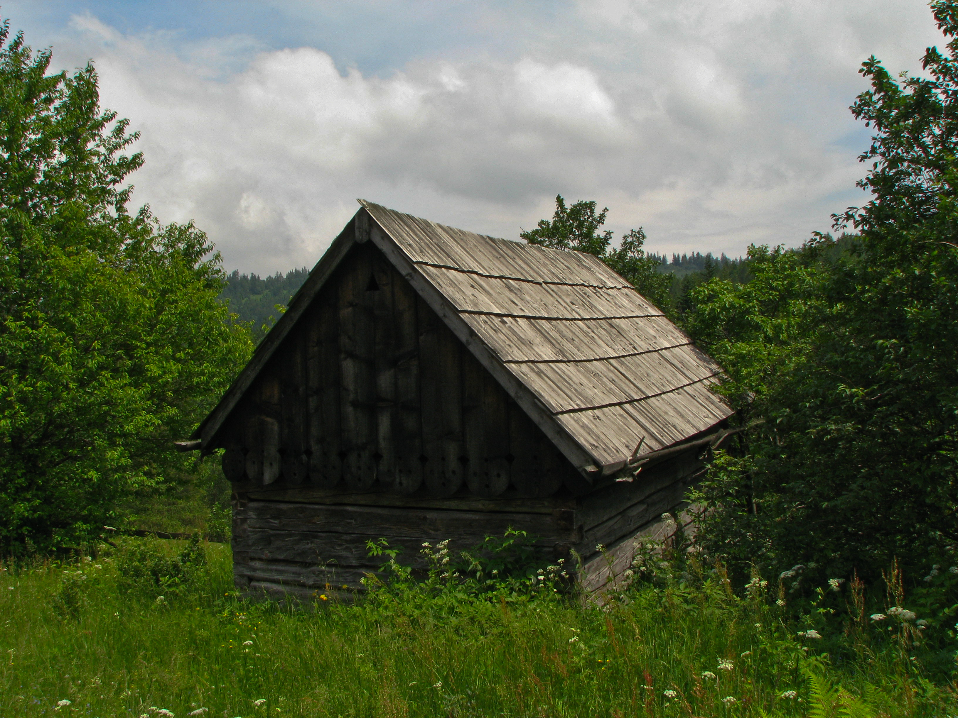 Ściana szczytowa piwniczki. Budynek o konstrukcji zrębowej z węgłami łączonymi na "oblap" bez ostatków. Dach dwuspadowy kryty gontem. Szczyt szalowany profilowanymi deskami.