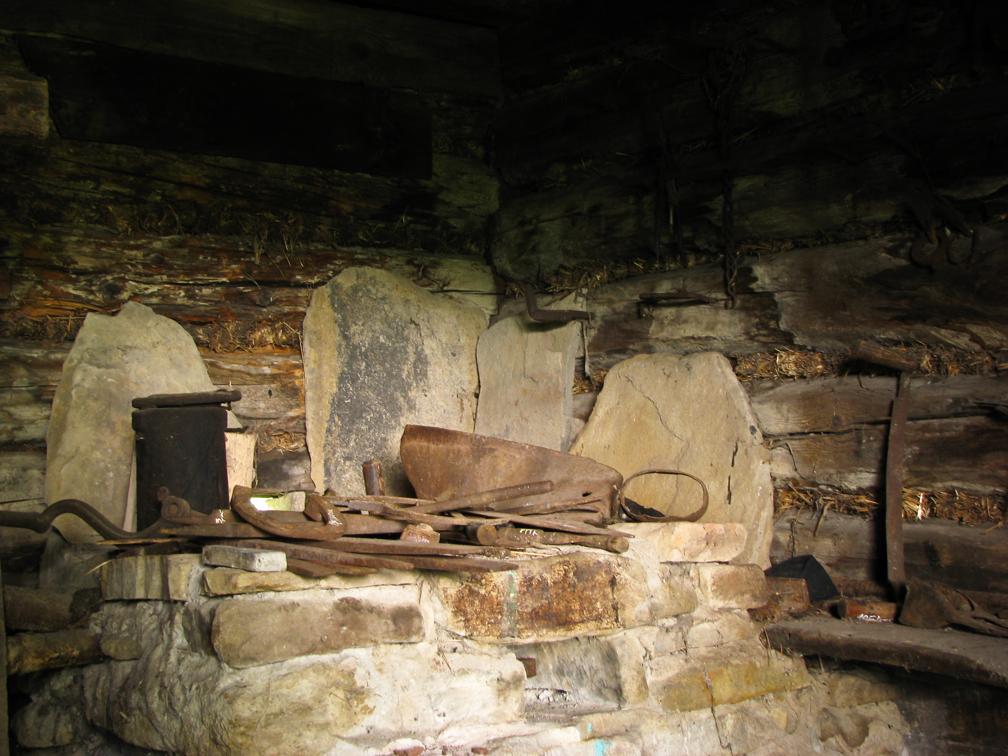 Wnętrze kuźni. Na zdjęciu widać kamienne palenisko.