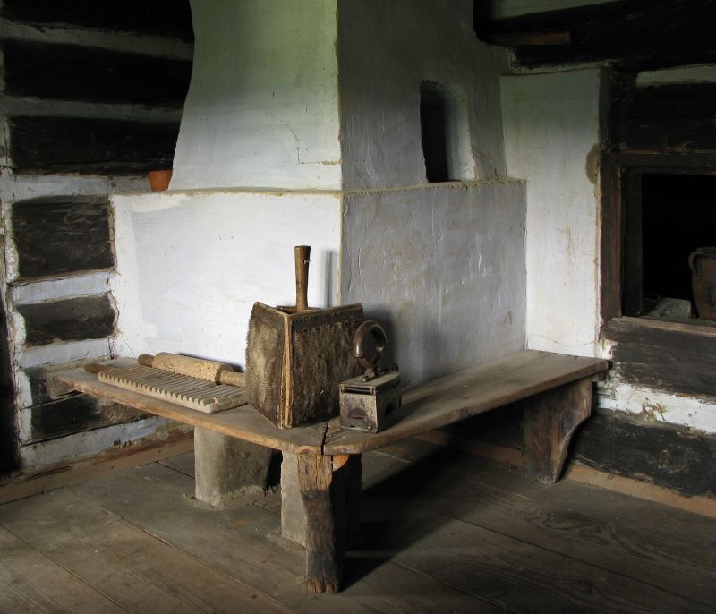 Korpus pieca w izbie białej ogrzewanego palniskiem w czarnej izbie. Ten typ pieca nazywany był "kachel". Z tyłu widoczny wąski zapiecek.