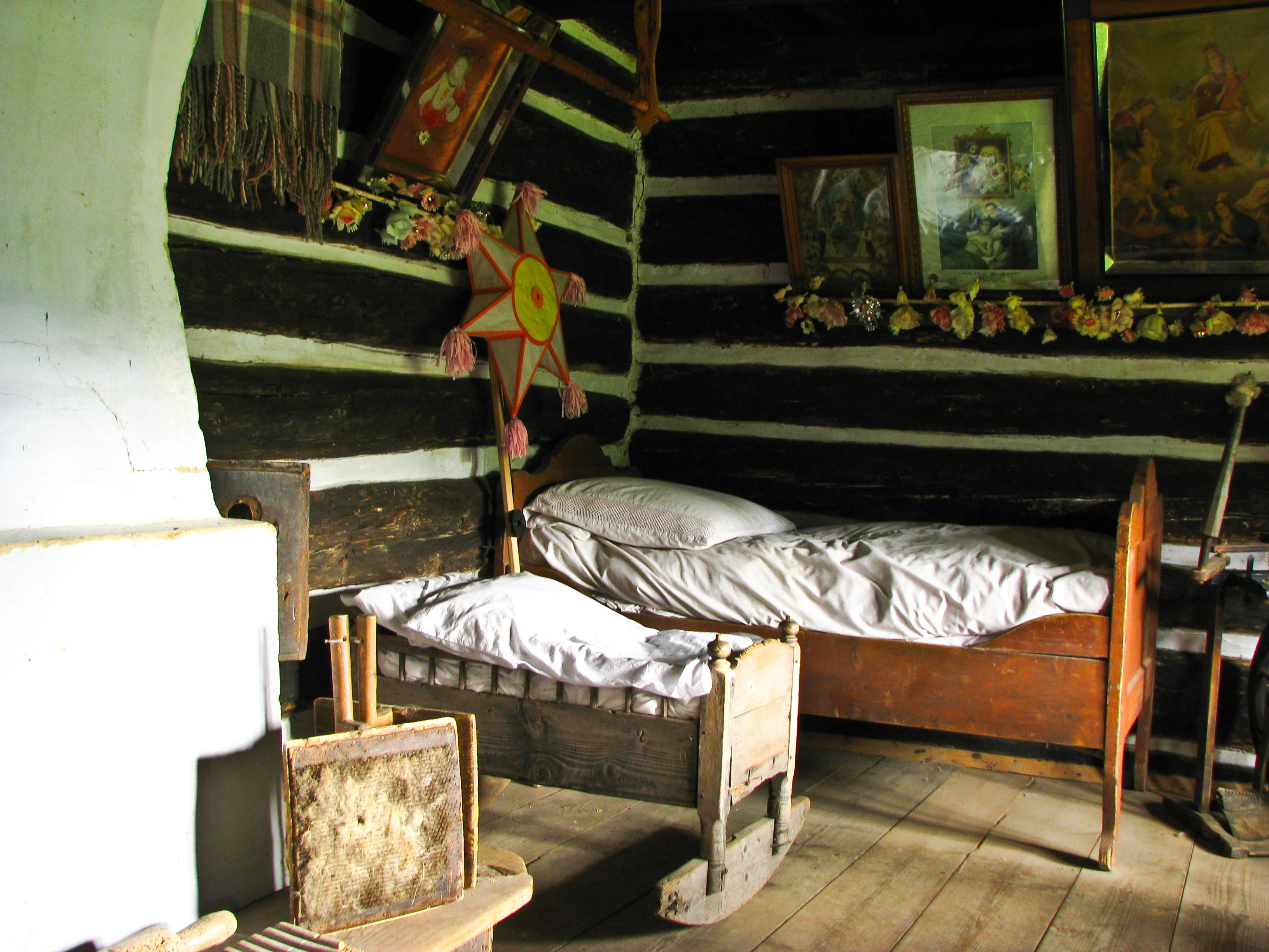 Wnętrze izby białej w chałupie Słopiakowej. Na zdjęciu widoczny fragment grzewczy pieca, drewniane łóżko i kołyska na biegunach, Gwiazda Betlejemska i oleodruki na ścianie ozdobione kwiatami z bibuły.