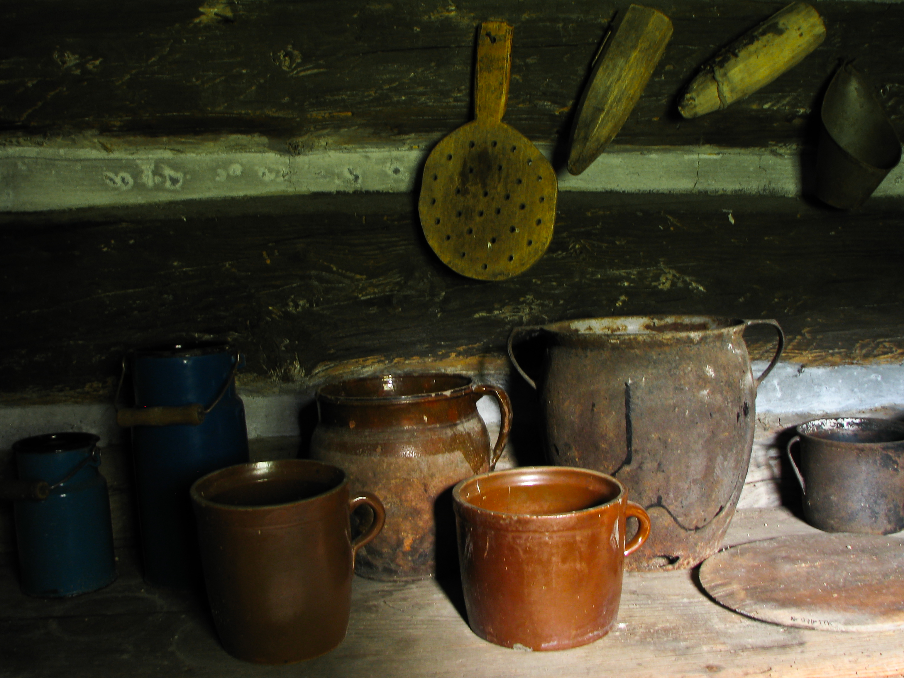 Wnętrze izby czarnej w chałupie Słopiakowej. Na zdjęciu widać garnki do gotowania, cedzak, bańki na mleko i inne przybory kuchenne.