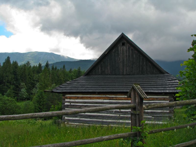 Ściana szczytowa chałupy Słopiakowej. Budynek o konstrukcji zrębowej z węgłami łączonymi na "obłap" bez ostatków. Fundament z kamienia. Dach półszczytowy kryty gontem.