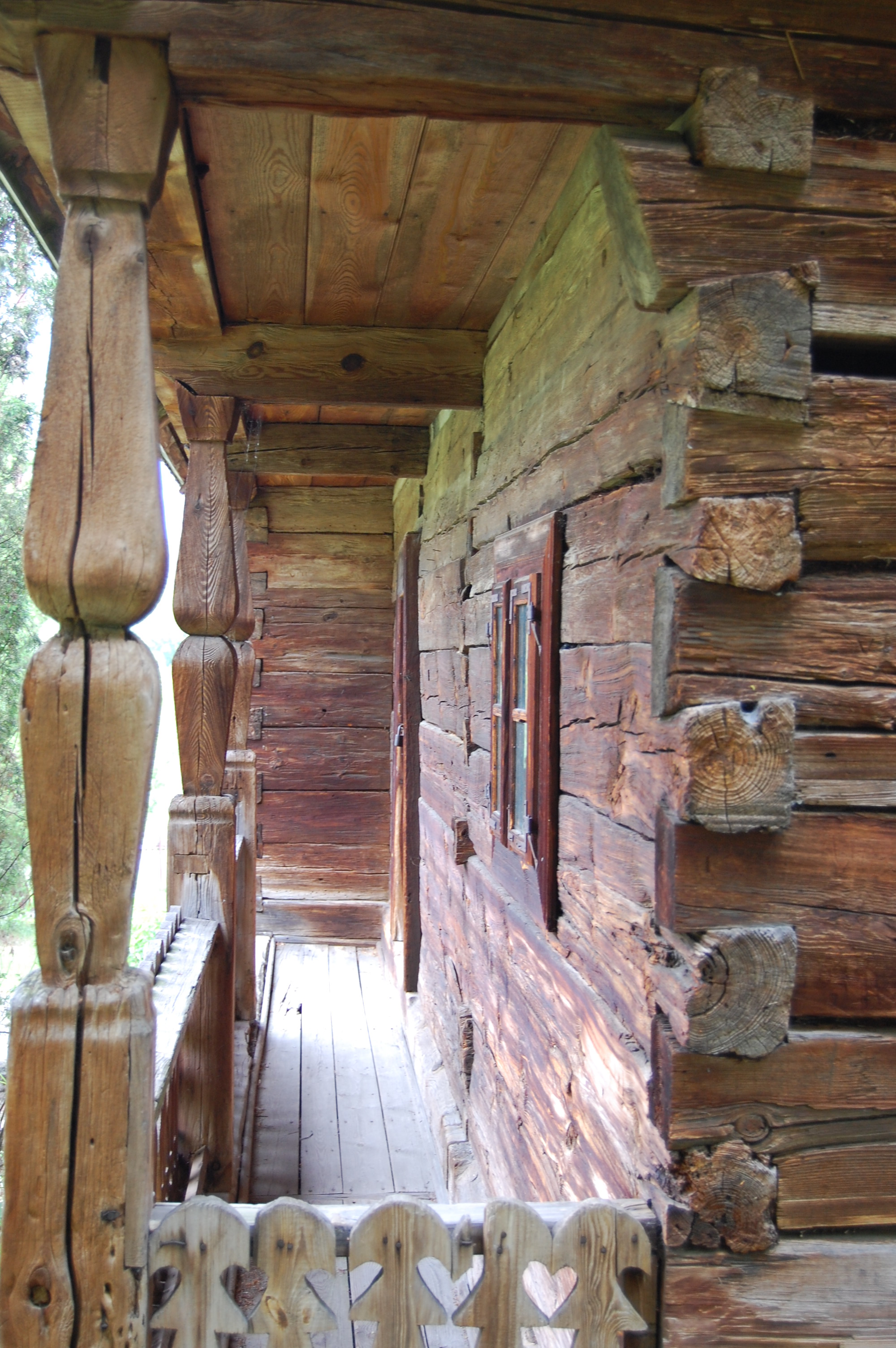 Widok na podcieniowy ganek chałupy ze wsi Witowy Most z II pol. XIX wieku. Chałupa o konstrukcji zrębowej z łączeniem naroży "na rybi ogon".