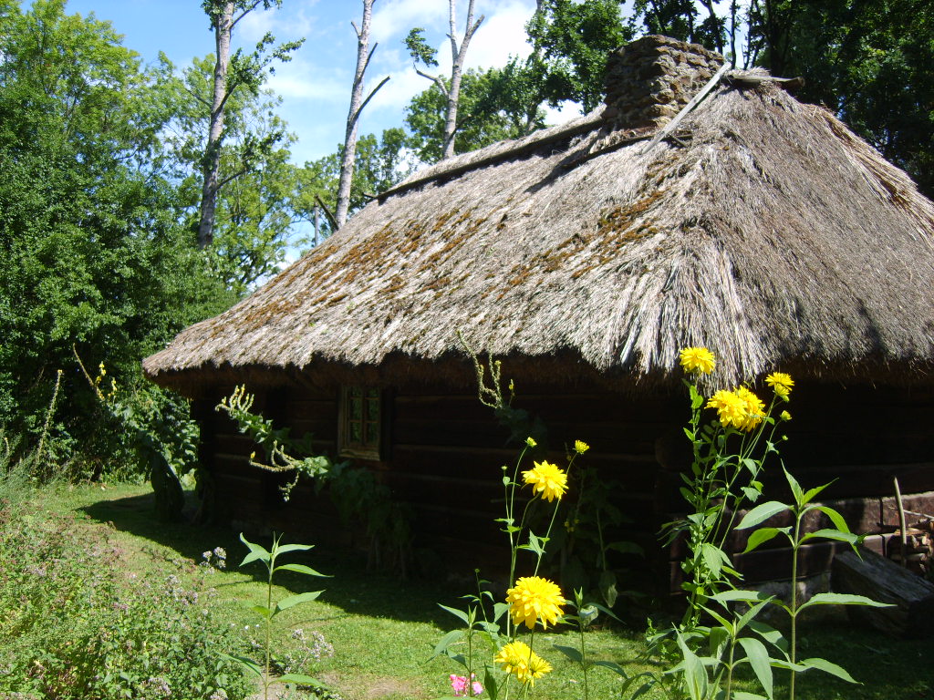 Jedna z chałup w Muzeum Wsi Opolskiej. Budynek o konstrukcji zrębowej, dach czterospadowy kryty słomą z widocznym systemem kominowym.