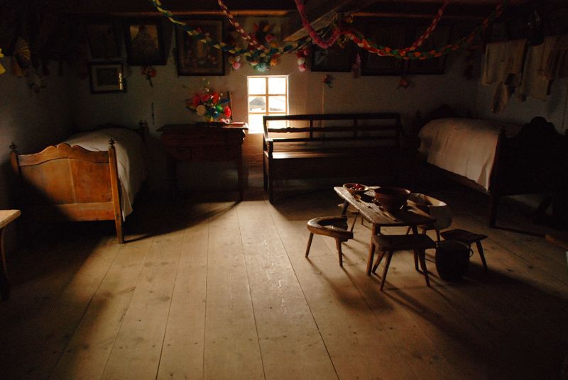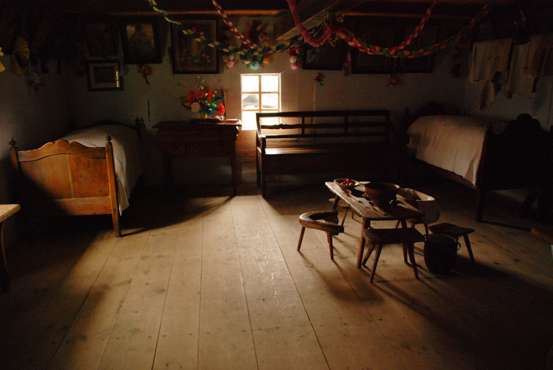 Wnętrze chałupy. Na zdjęciu widoczne łóżka, ława i zydle do siedzenia oraz papierowe ozdoby i święte obraz.