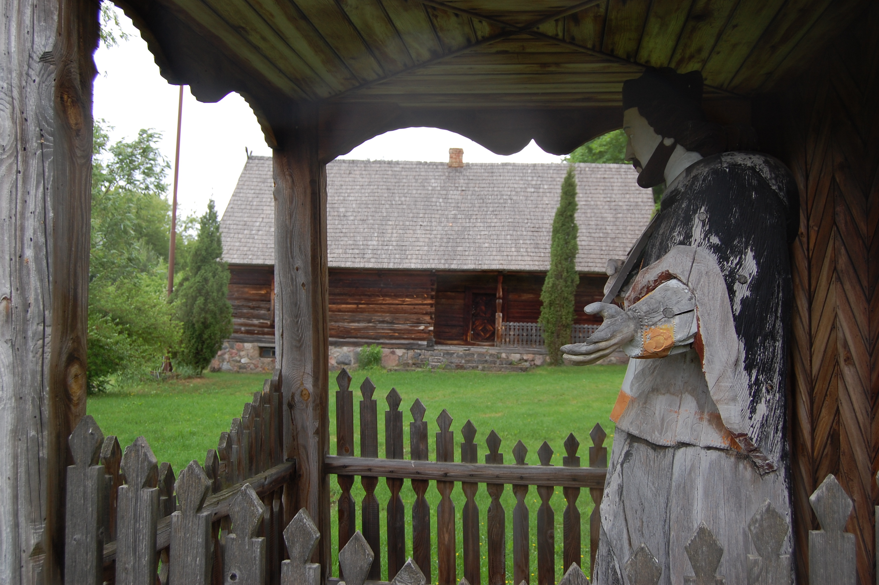 Kapliczka św. Jana Nepomucena ze wsi Tarnowo z XVIII w. W głębi chałupa z Witowego Mostu z II pol. XIX w.