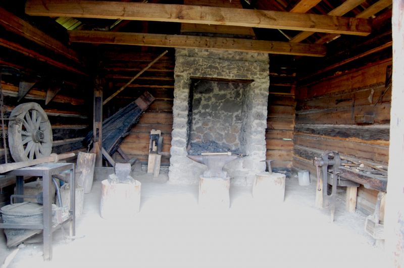 Wnętrze Kuźni ze wsi Zalas z końca XVIII w. W kuźni znajduje się palenisko tzw. kotlina zbudowana z kamieni polnych i wytopionej rudy darniowej.