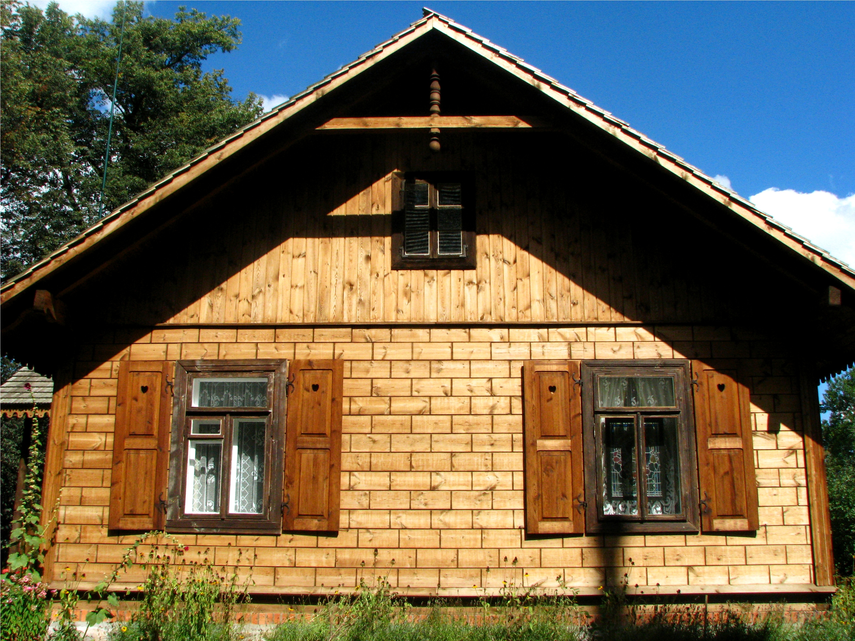 Drewniana wikarówka z Kuleszy Kościelnych. Na zdjęciu ściana szczytowa. Dach dwuspadowy.