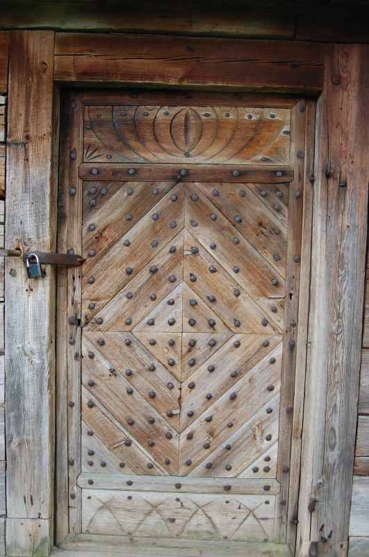 Bogato zdobione, szalowane drzwi olejarni ze wsi Witowy Most z XIX w.