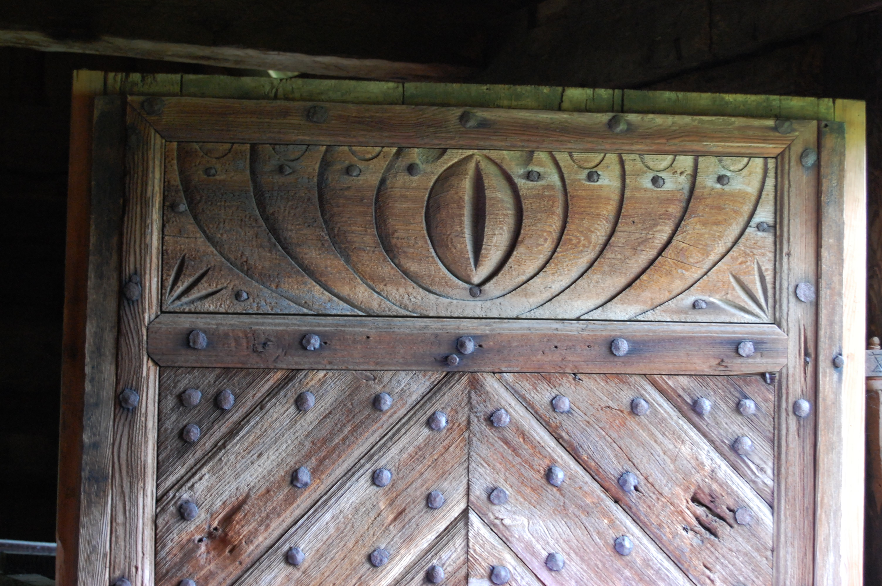 Bogato zdobione, szalowane drzwi olejarni ze wsi Witowy Most z XIX w.