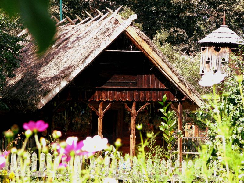 Spichlerz i gołębnik słupowy. Na zdjęciu dokładnie widać liczne detale podcienia. Powieszone są wiązanki ziół, robione przez osoby zwiedzające w święto ziół.