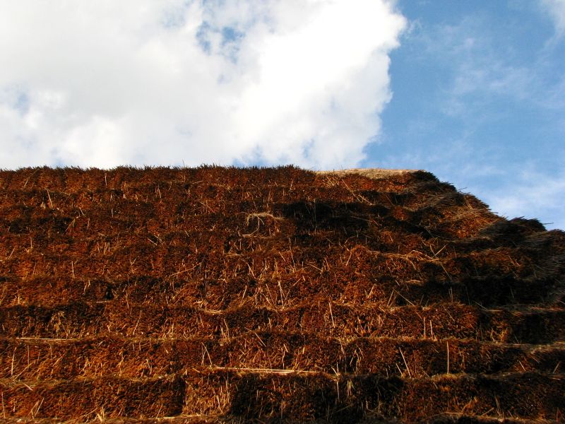 Dach stodoły z Kopci-Górali z poł. XVIII w. Dach kryty słomą kładzioną schodkowo.