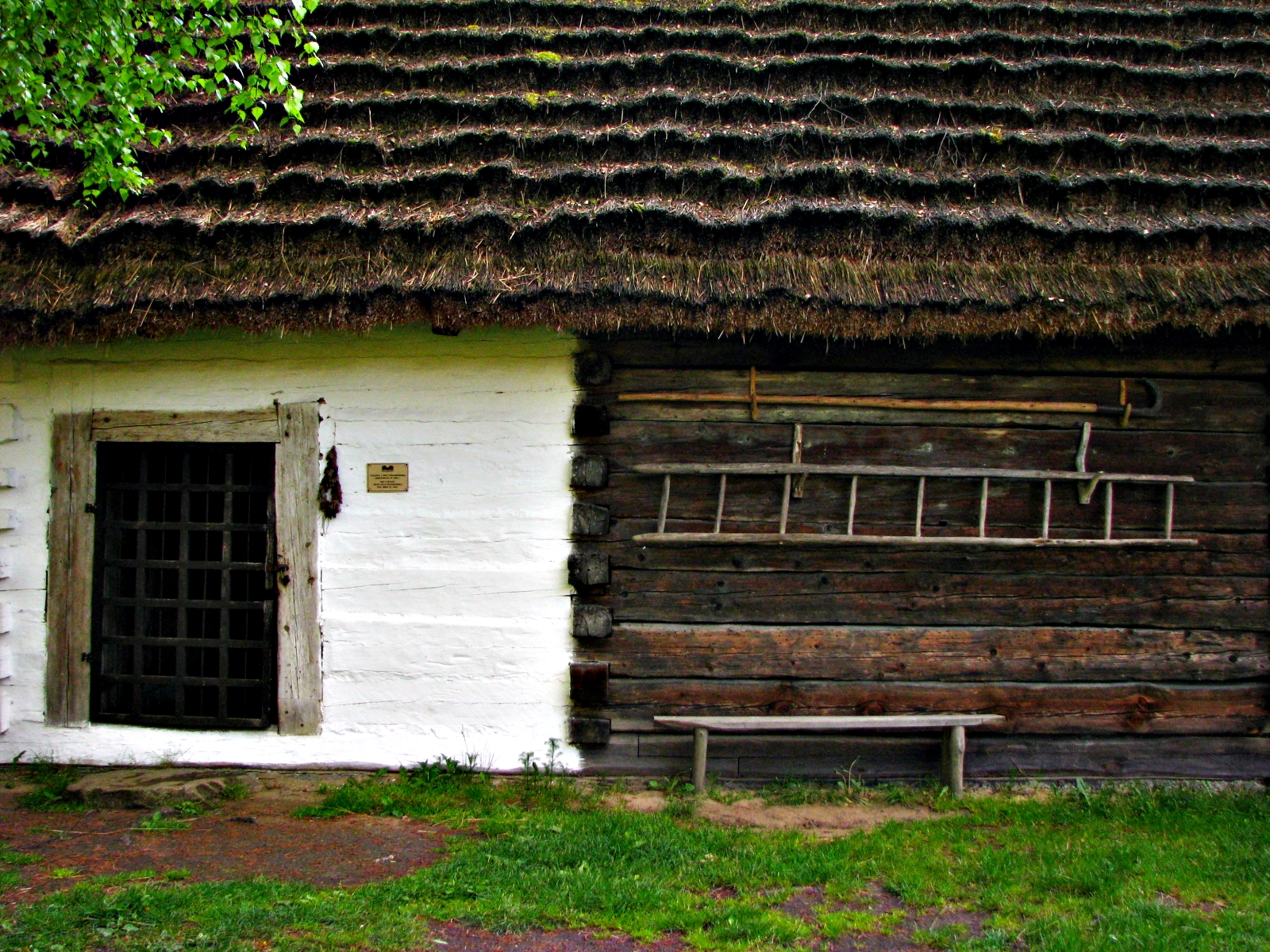 Zagroda z Huty Przedborskiej. Na zdjęciu chałupa z Huty Przedborskiej z 1862 r. Na zdjęciu widoczna pobielona część mieszkalna i część gospodarska.