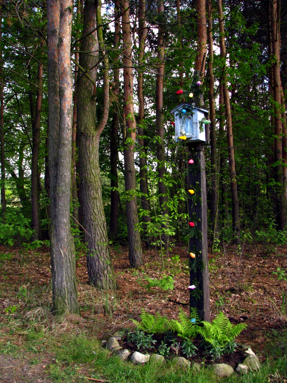 Kapliczka skrzynkowa z blaszanym daszkiem, w której znajduje się gipsowy odlew „Matki Boskiej Niepokalanie Poczętej”. Kapliczka z Kolbuszowej Górnej z XIX w.