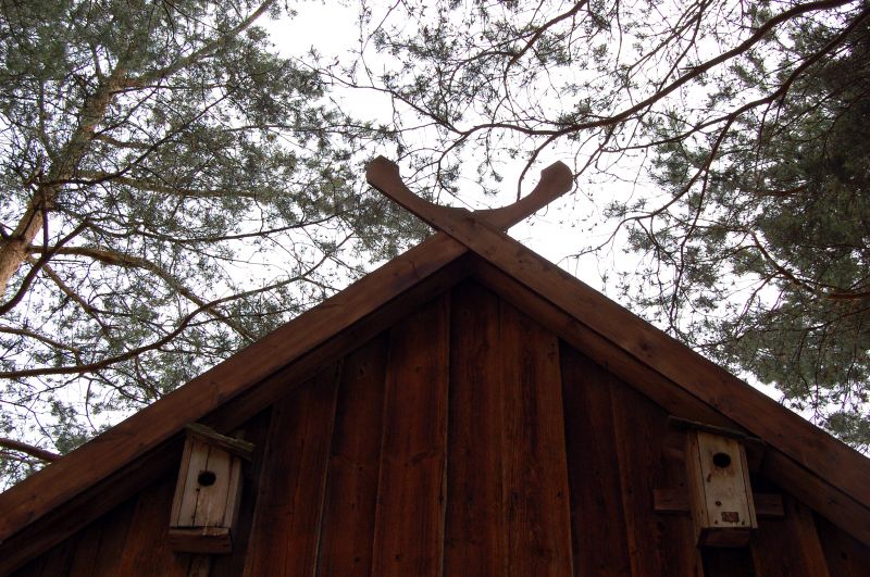 Szczyt z widocznymi „śparogami” - zdobieniami wieńczącymi szczyt dachu kurpiowskiej chałupy ze wsi Gawrychy z XVIII wieku.