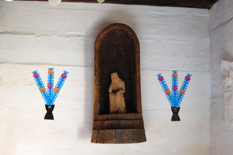 Drewniana figurka Chrystusa Frasobliwego w chałupie ze wsi Gawrychy z XVIII w. PO bokach papierowe wycinanki z kurpiowskimi papierowymi kwiatami