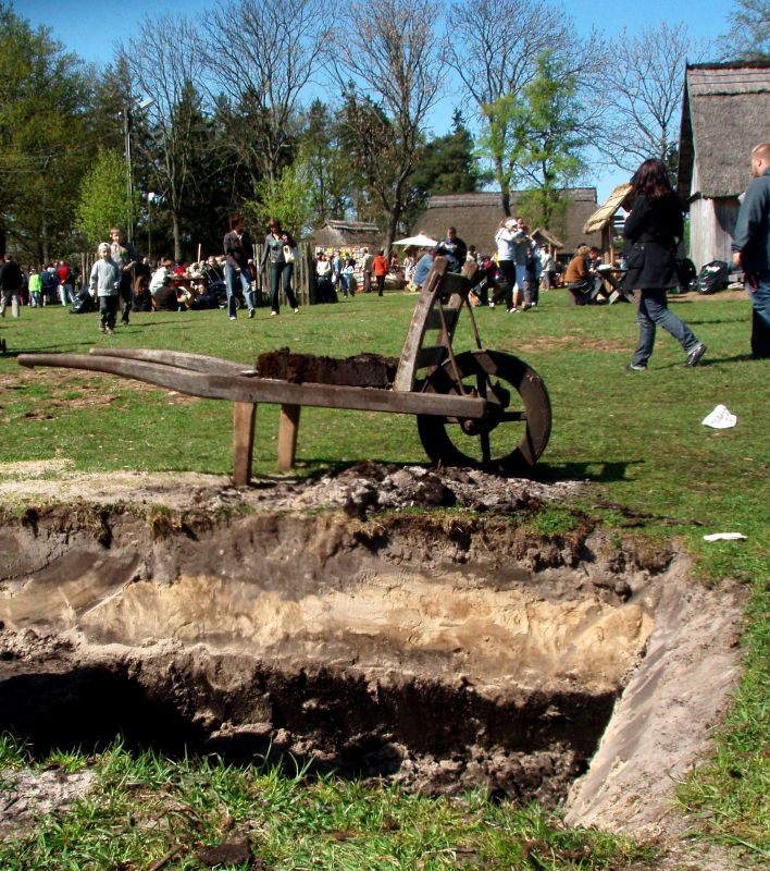 Taczka do torfu. Na zdjęciu widoczny jest dół z którego pozyskiwany torf. Torfu używano jako ściółki dla zwierząt, a pośledniejszymi gatunkami użyźniano piaszczyste grunty. W trakcie dorocznej imprezy p.t. "Czarne wesele" prezentowany jest tradycyjny sposób wydobycia torfu.