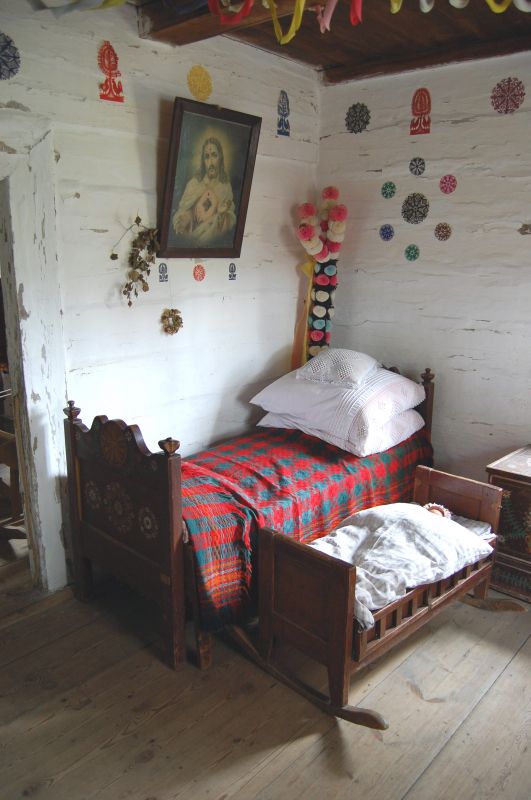 Ciągły alkierz w XIX-wiecznej chałupie ze wsi Kadzidło. Łóżko z kurpiowskimi zdobieniami. Na ścianach kurpiowskie jednobarwne wycinanki.