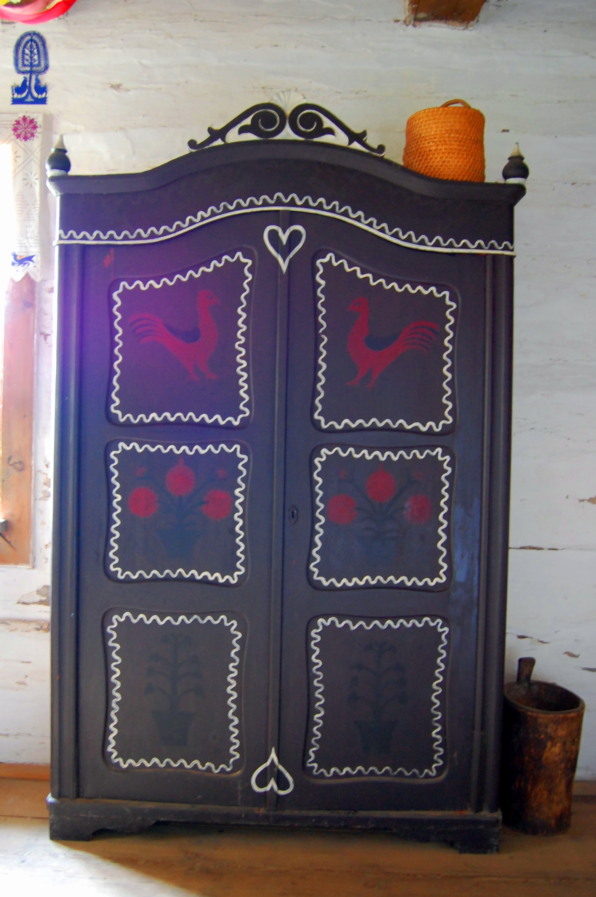 Szafa z kurpiowskimi zdobieniami w alkierzu XIX-wiecznej chałupy ze wsi Kadzidło.