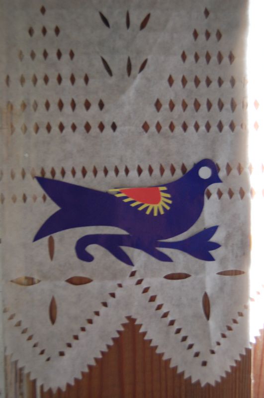 Ptaszek z papieru zdobiący firankę.