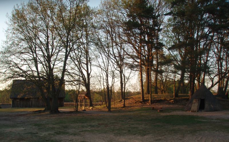 Muzeum wsi Słowińskiej w Klukach. Po lewej w tle widnieje magazyn rybacki, po prawej piwnica naziemna.