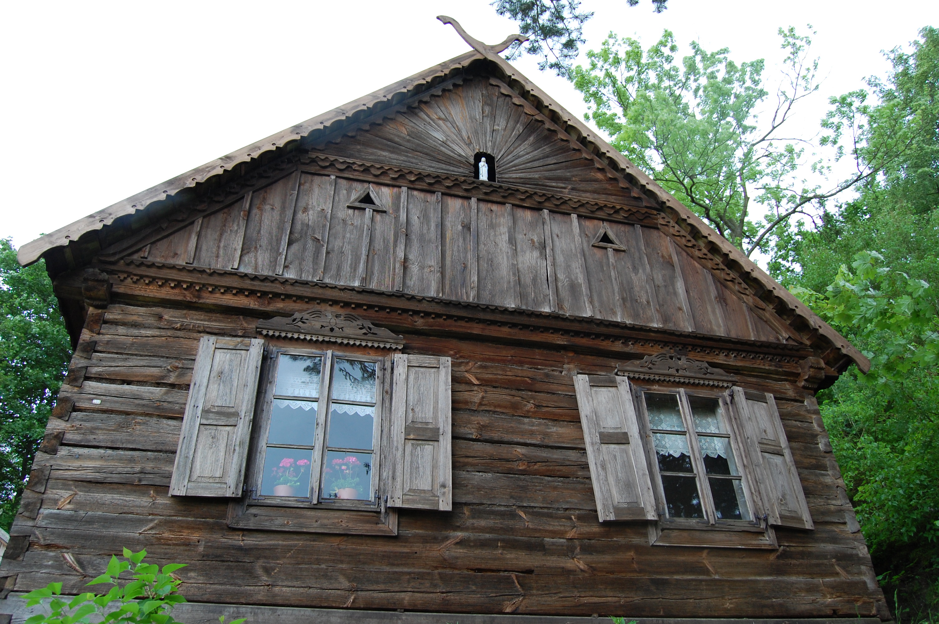 Chałupa ze wsi Myszyniec Stary z XIX wieku. Chałupa o konstrukcji zrębowej z narożami łączonymi "na rybi ogon".Dach dwuspadowy o konstrukcji krokwiowej-jetkowej pokryty gontem z wieńczącymi szczyty śparogami. Chałupa o zdobionej stolarce okiennej: okna ze zdobionymi nadokiennikami (koruny) i okiennicami. Szczyt chałupy pokryty szalunkiem z motywem solarnym (promienie odchodzą od ustawionej w wyciętym okienku figurki Matki Boskiej). |