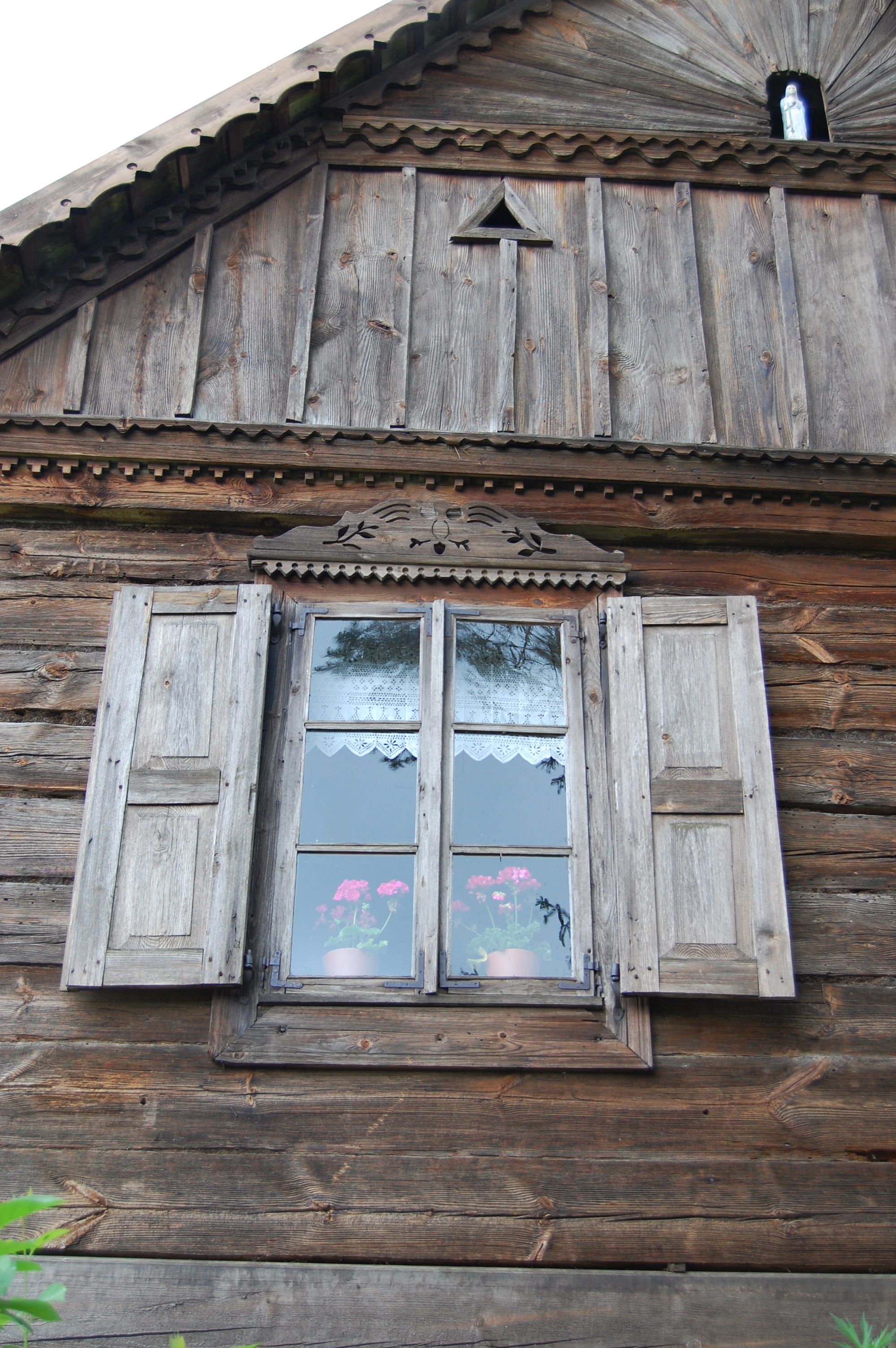 Okno i fragment ściany szczytowej XIX-wiecznej chałupy ze wsi Myszyniec Stary. Okno ze zdobionym nadokiennikiem (koruny) i okiennicami.