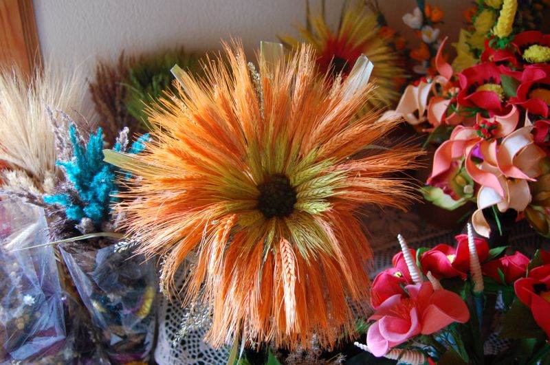 Kwiat z pszenicy w otoczeniu charakterystycznych dla Kurpiowszczyzny kwiatów z bibuły.