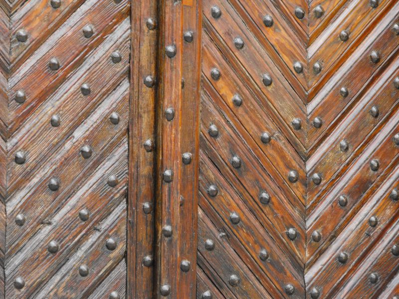 Widoczna konstrukcja szalowanych drzwi kościoła i ozdobne nabijanie gwoździami.