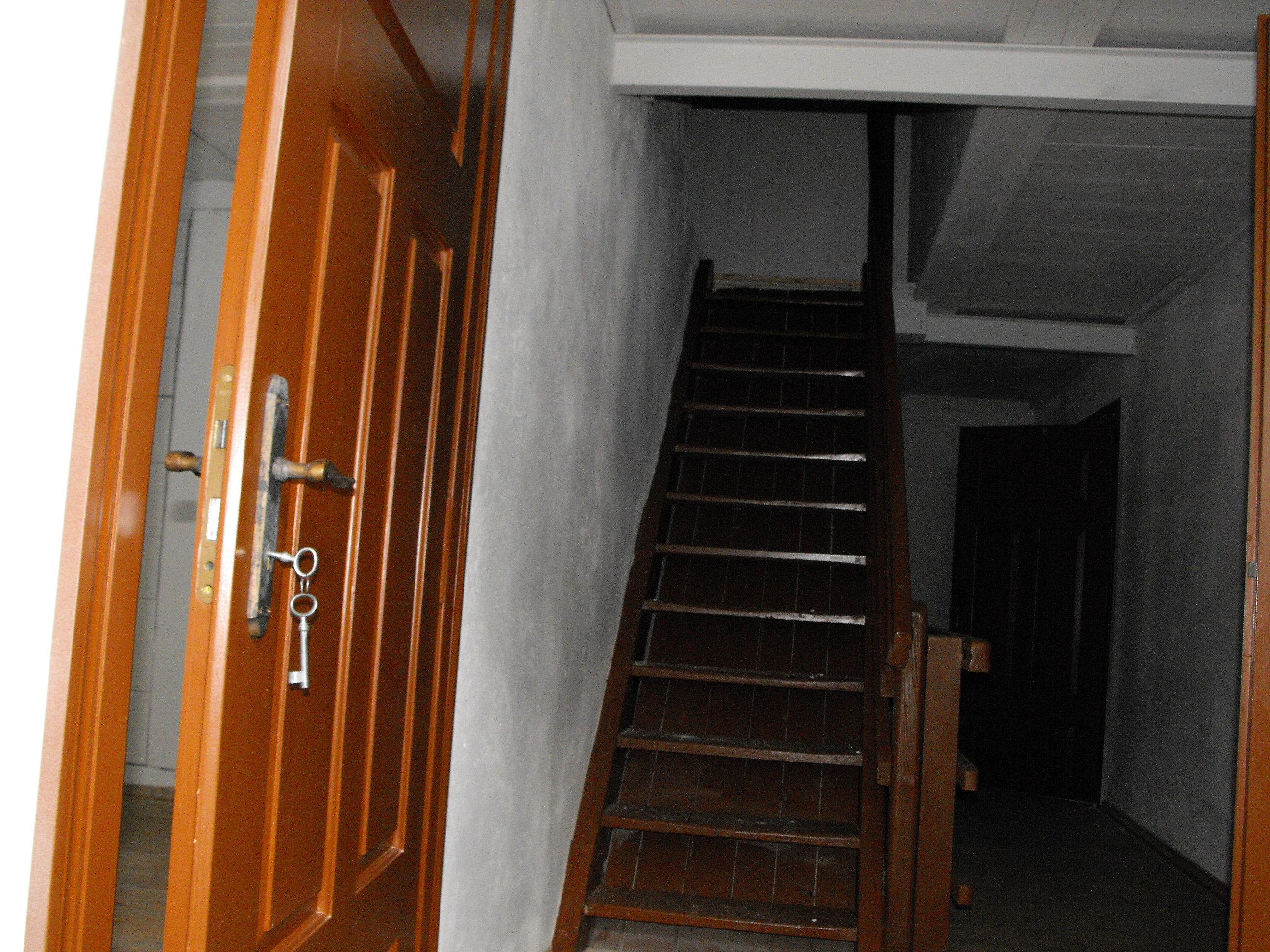 Wnętrze drewnianego budynku mieszkalnego z ulicy Wólczańskiej 68. Schody prowadzą na poddasze.