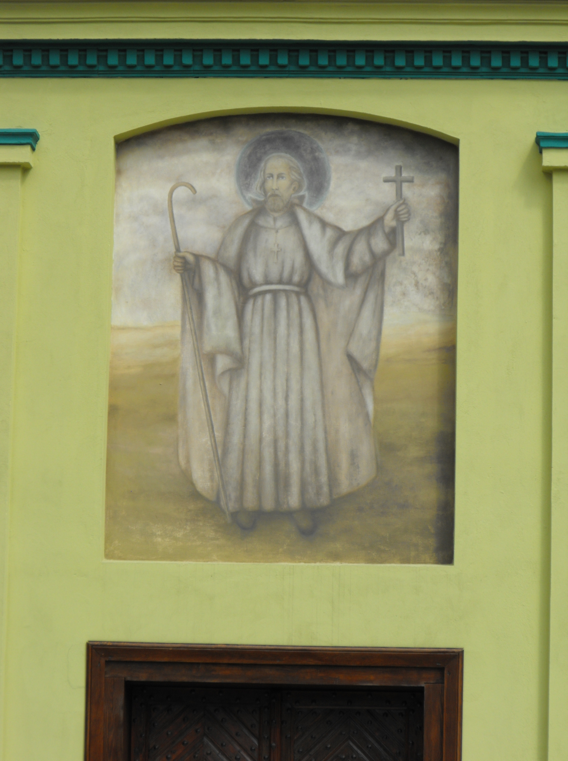 Zrekonstruowane malowidło nad wejściem do kościoła pod wezwaniem świętego Andrzeja Boboli translokowanego z Nowosolnej (ul. Rynek Nowosolna 13) z lat 1846-1848.