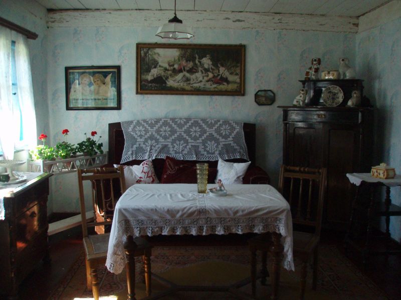 Wnętrze chałupy mieszkalnej. Wystrój wnętrza pokazuje zmiany jakie zachodziły pod wpływem kultury miejskiej.