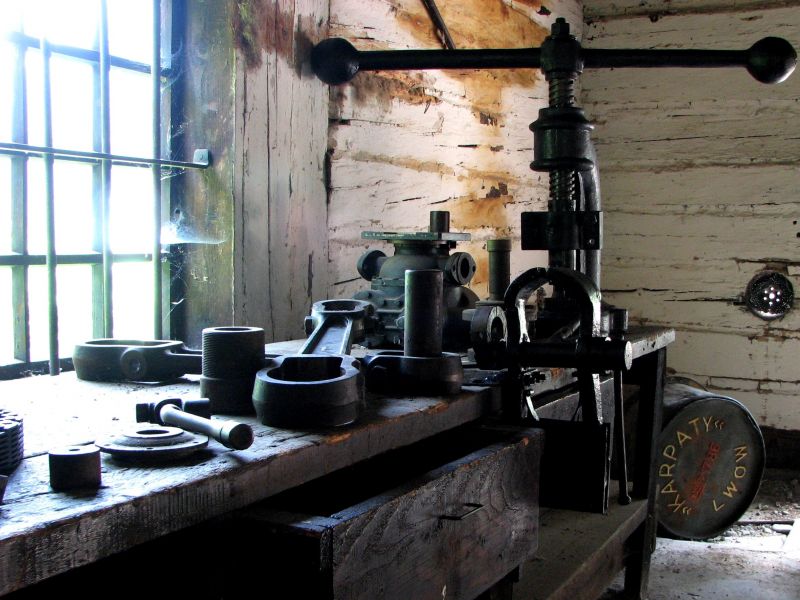 Wnętrze warsztatu kopalni Bóbrka wybudowanego w 1864 roku. Znajdują się tam zabytkowe urządzenia i maszyny: po prawo prasa i imadło, na stole narzędzia do obsługi maszyn.