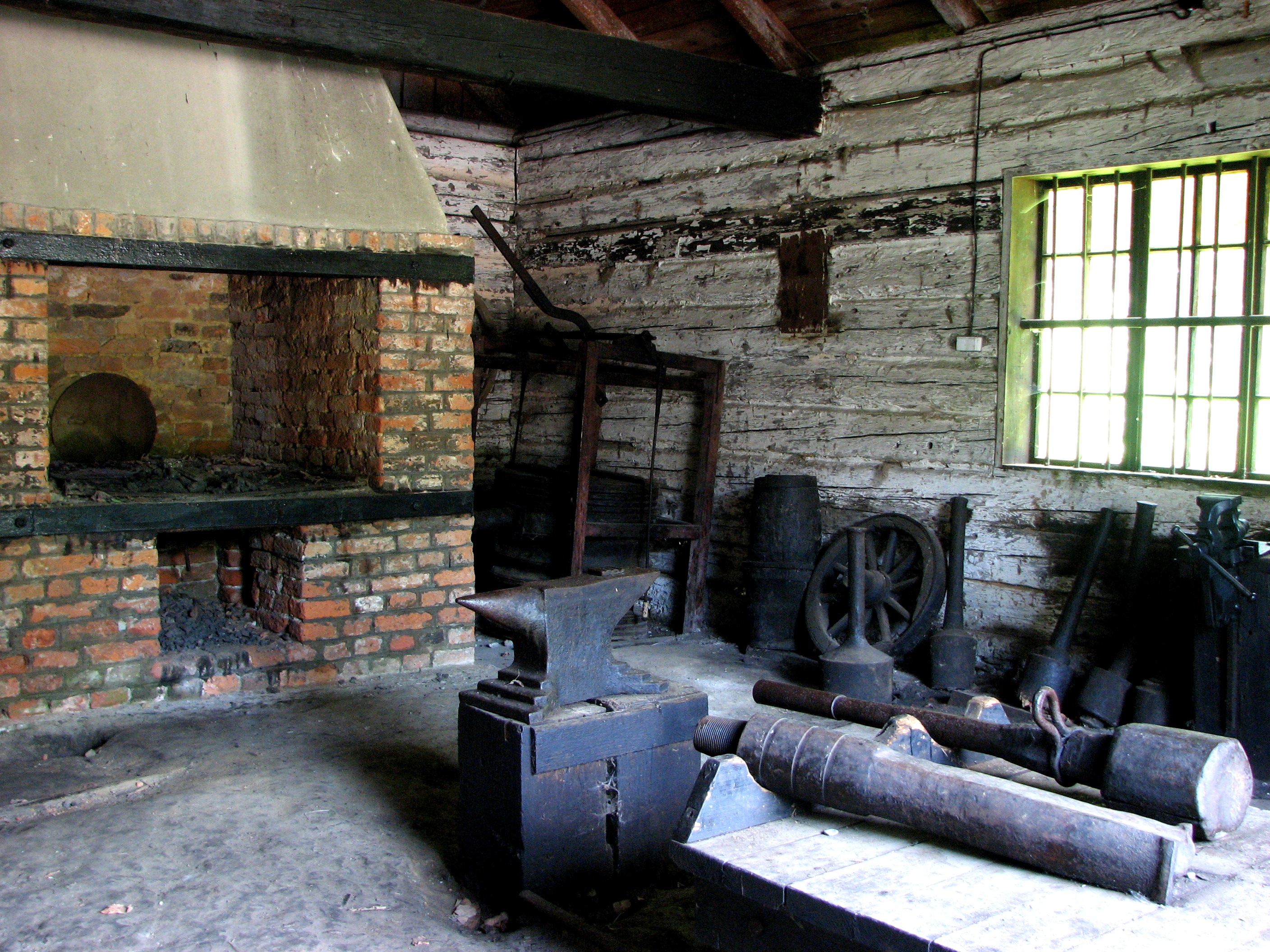 Wnętrze kuźni. Na pierwszym planie kowadło i młoty, z tyłu paleniska.