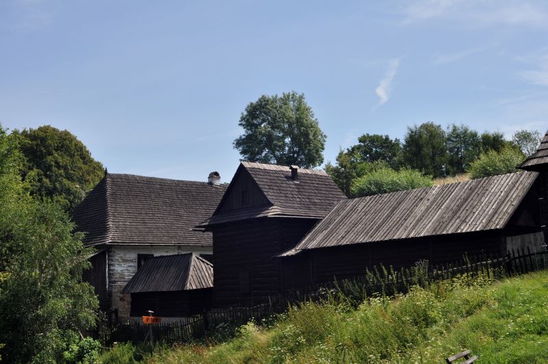 Widok ogólny na budynki muzeum. Od lewej: karczma, mała wozownia, kurnik i duża wozownia.